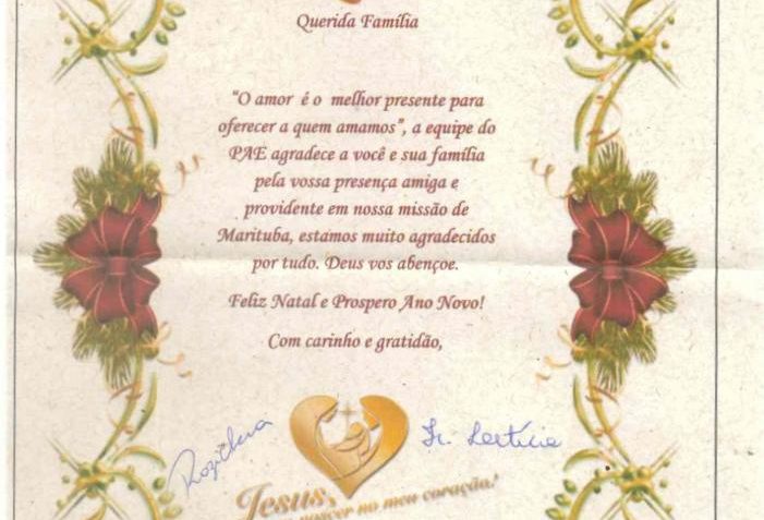 «L’amore è il miglior regalo che possiamo offrire a quanti amiamo»: così inizia il messaggio augurale in vista del prossimo Natale che suor Leticia e Rozicleia – responsabili del progetto di adozioni a distanza dei bambini di Marituba – hanno inviato nei giorni scorsi a padrini e madrine italiane. «La vostra presenza è amica e provvidenziale», sottolineano nel messaggio, composto all’interno di un’elegante cornice floreale e accompagnato da espressioni di riconoscenza.